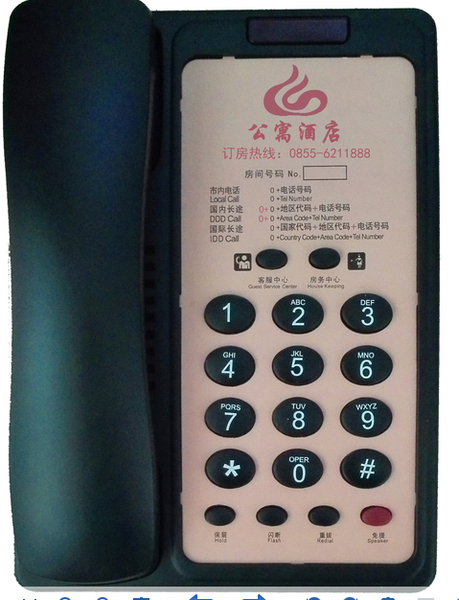 诺巴玛A9电话机专为高中档大酒店设计,独有的大面板空间可印刷酒店店标,订房电话和地址等等,独有的二组一键通按键方便简洁。LOGO定制可以很好的展示了酒店的风格,大大提升酒店的档次。合作客户包括知名的戴斯酒店,维也纳、 喜来登、海南天佑,7天酒店,速8酒店 格林豪泰 万豪酒店等。丝网印刷永不掉色,防水耐磨,永不掉色,一次投资永久使用,产品质保三年,百日换新!是酒店客房电话机的首选品牌