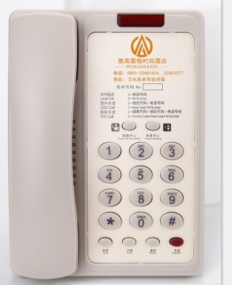 诺巴玛A9电话机专为高中档大酒店设计,独有的大面板空间可印刷酒店店标,订房电话和地址等等,独有的二组一键通按键方便简洁。LOGO定制可以很好的展示了酒店的风格,大大提升酒店的档次。合作客户包括知名的戴斯酒店,维也纳、 喜来登、海南天佑,7天酒店,速8酒店 格林豪泰 万豪酒店等。丝网印刷永不掉色,防水耐磨,永不掉色,一次投资永久使用,产品质保三年,百日换新!是酒店客房电话机的首选品牌