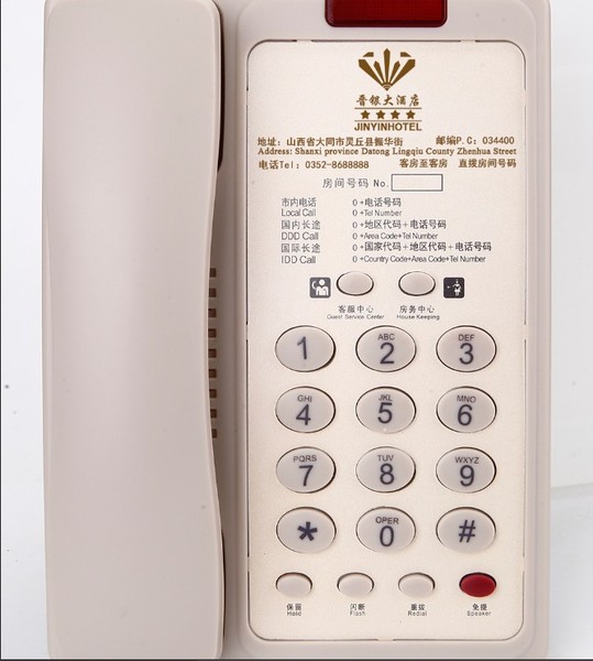 诺巴玛A9电话机专为高中档大酒店设计,独有的大面板空间可印刷酒店店标,订房电话和地址等等,独有的二组一键通按键方便简洁。LOGO定制可以很好的展示了酒店的风格,大大提升酒店的档次。合作客户包括知名的戴斯酒店,维也纳、 喜来登、海南天佑,7天酒店,速8酒店 格林豪泰 万豪酒店等。丝网印刷永不掉色,防水耐磨,永不掉色,一次投资永久使用,产品质保三年,百日换新!是酒店客房电话机的首选品牌