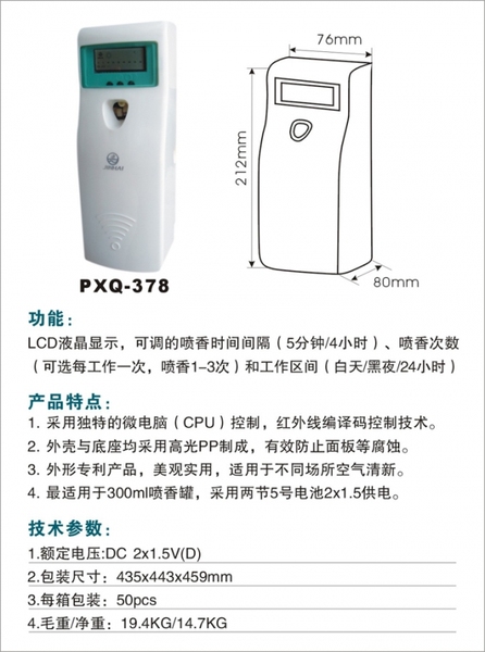 4. 最适用于300ml喷香罐,采用两节5号电池2x1.5供电。