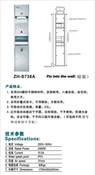 4.红外线自动感应干手器,功率强劲,干手爽快;防滴水结构,安全可靠;干手风口避开清洁箱。(可先择不同型号及功率的干手器)