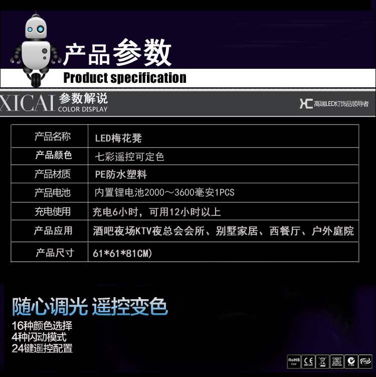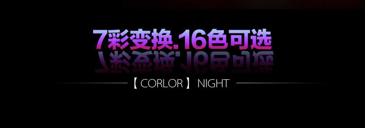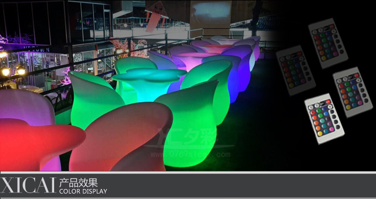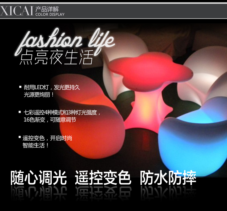 产品外壳采用PE环保材料滚塑一次成型,利用LED的色彩模式(RGB)原理,可用遥控器控制颜色慢速、快速变化,红、橙、黄、绿、青、蓝、紫、种颜色和亮度。
