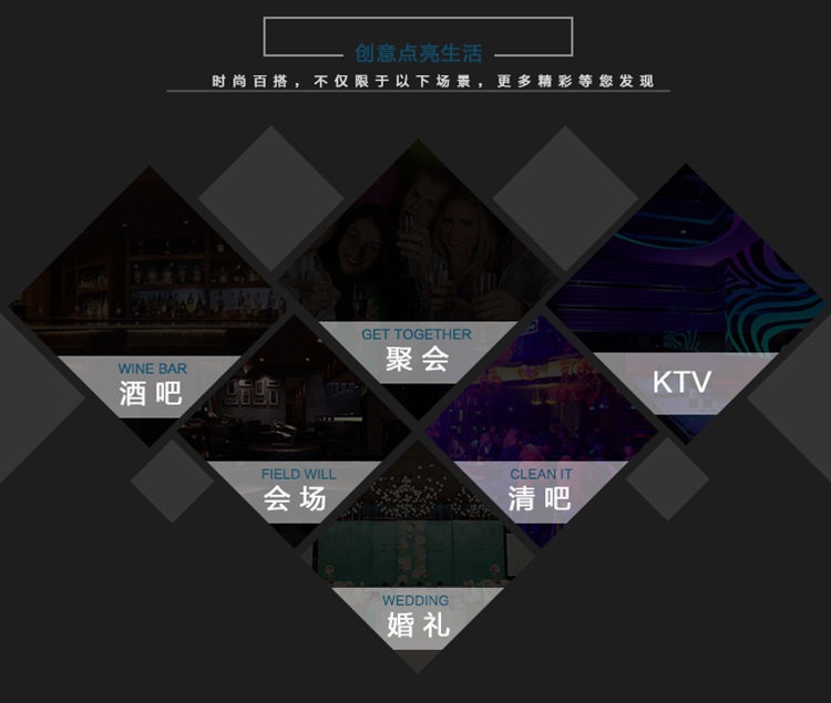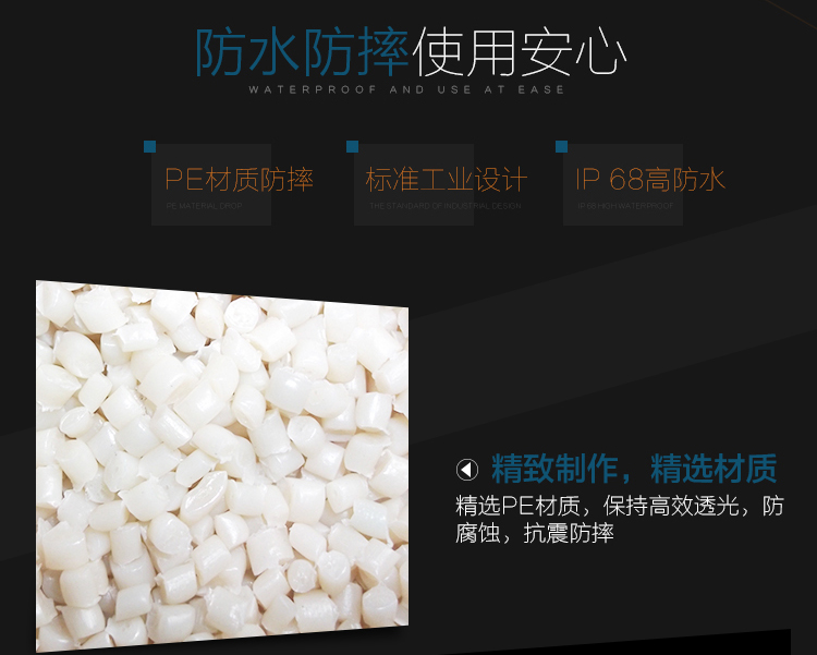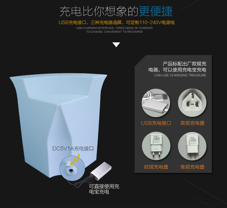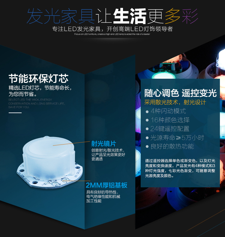 产品外壳采用PE环保材料滚塑一次成型,利用LED的色彩模式(RGB)原理,可用遥控器控制颜色慢速、快速变化,红、橙、黄、绿、青、蓝、紫、种颜色和亮度。