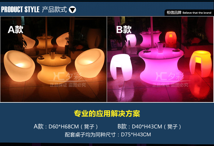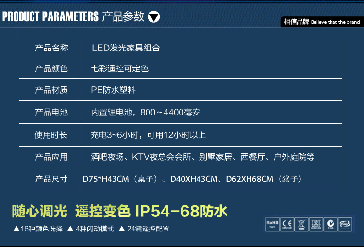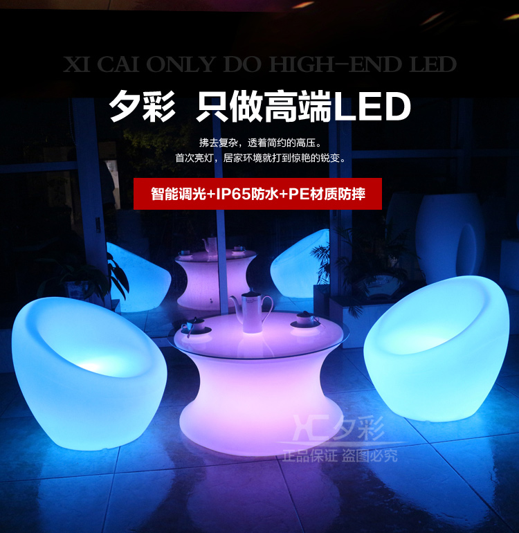 产品外壳采用PE环保材料滚塑一次成型,利用LED的色彩模式(RGB)原理,可用遥控器控制颜色慢速、快速变化,红、橙、黄、绿、青、蓝、紫、种颜色和亮度。