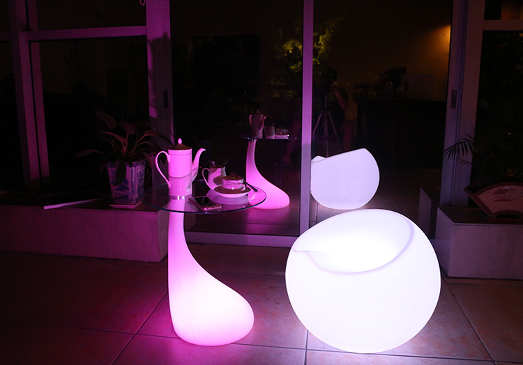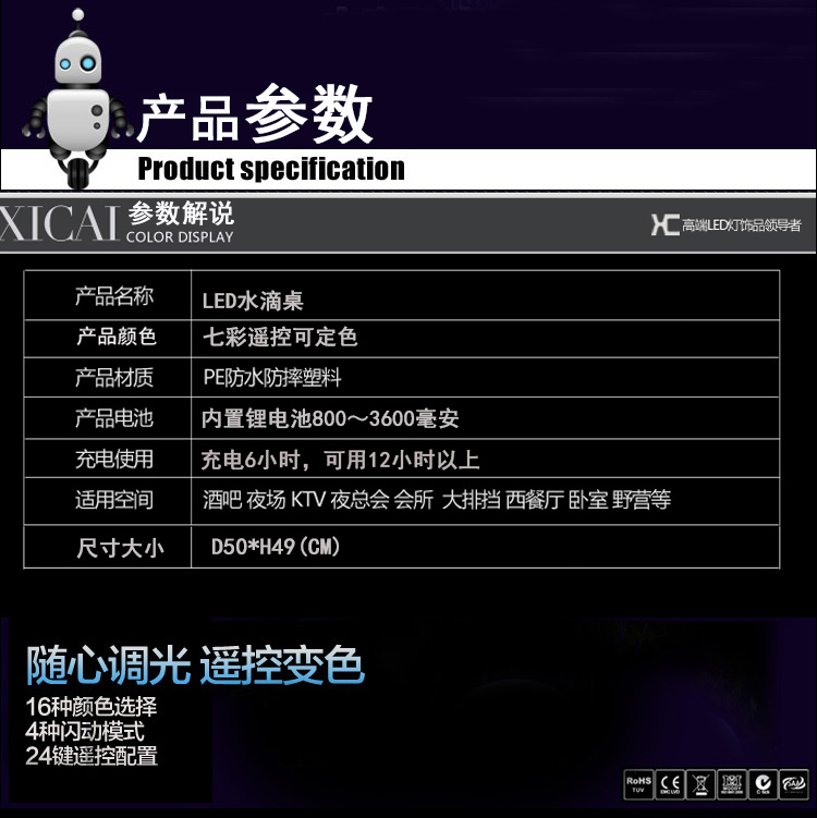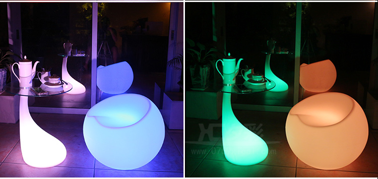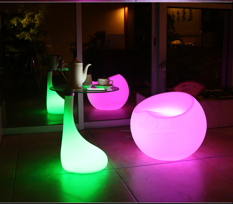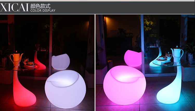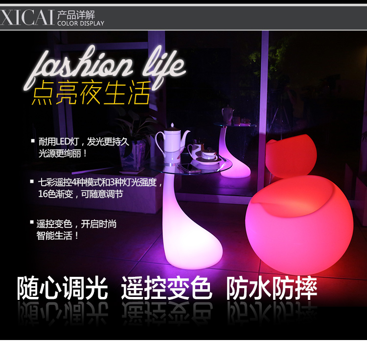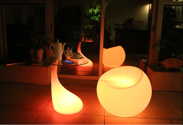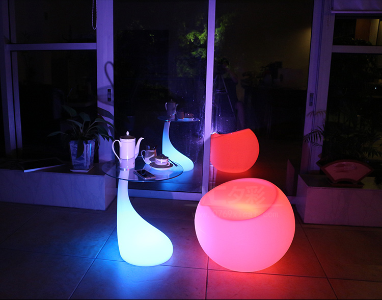 产品外壳采用PE环保材料滚塑一次成型,利用LED的色彩模式(RGB)原理,可用遥控器控制颜色慢速、快速变化,红、橙、黄、绿、青、蓝、紫、种颜色和亮度。