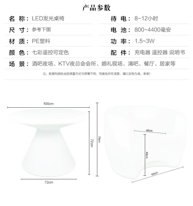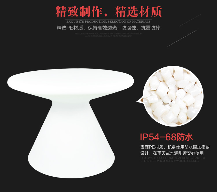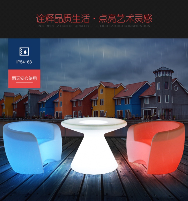 产品外壳采用PE环保材料滚塑一次成型,利用LED的色彩模式(RGB)原理,可用遥控器控制颜色慢速、快速变化,红、橙、黄、绿、青、蓝、紫、种颜色和亮度。