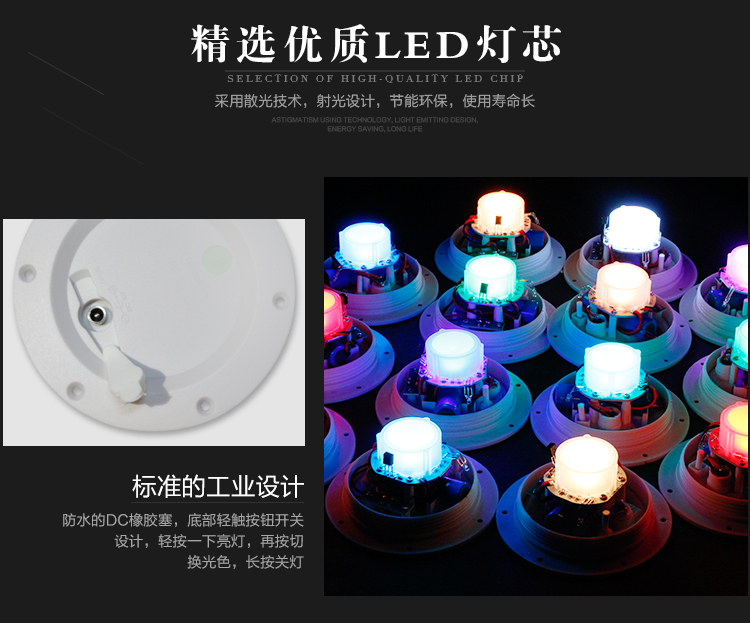 产品外壳采用PE环保材料滚塑一次成型,利用LED的色彩模式(RGB)原理,可用遥控器控制颜色慢速、快速变化,红、橙、黄、绿、青、蓝、紫、种颜色和亮度。