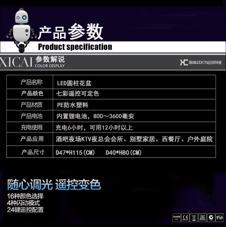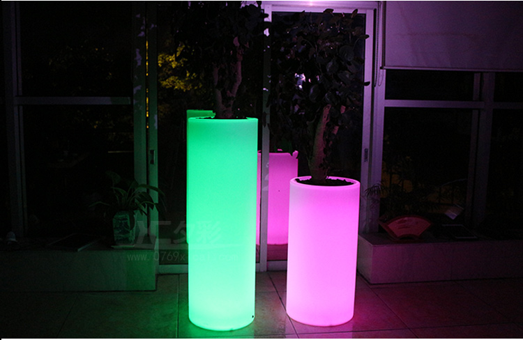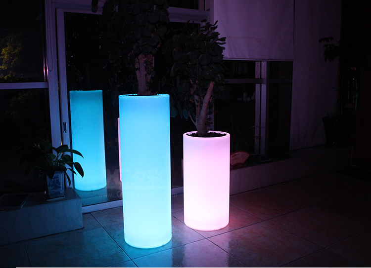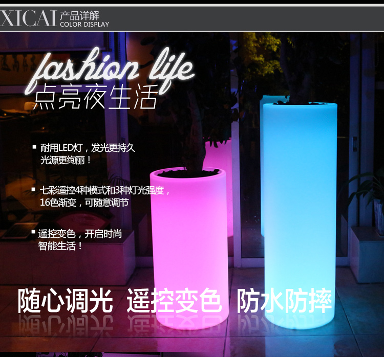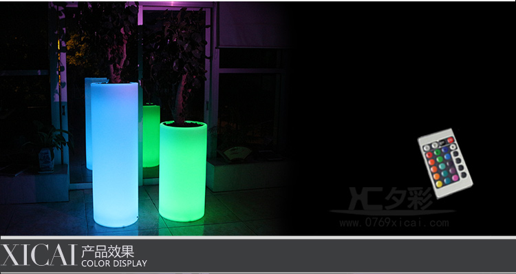 产品外壳采用PE环保材料滚塑一次成型,利用LED的色彩模式(RGB)原理,可用遥控器控制颜色慢速、快速变化,红、橙、黄、绿、青、蓝、紫、种颜色和亮度。