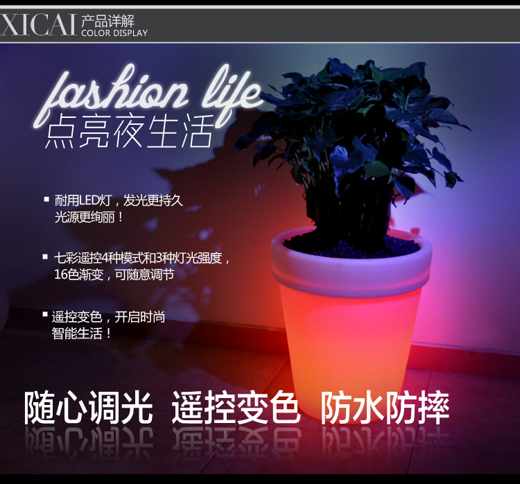 产品外壳采用PE环保材料滚塑一次成型,利用LED的色彩模式(RGB)原理,可用遥控器控制颜色慢速、快速变化,红、橙、黄、绿、青、蓝、紫、种颜色和亮度。