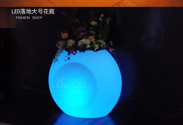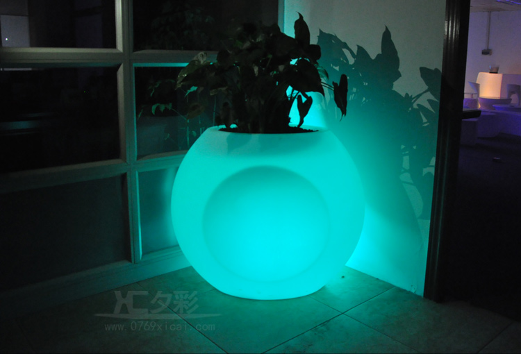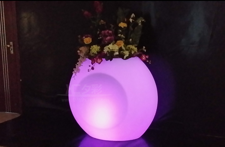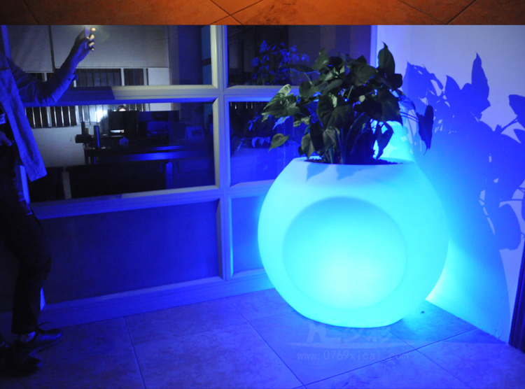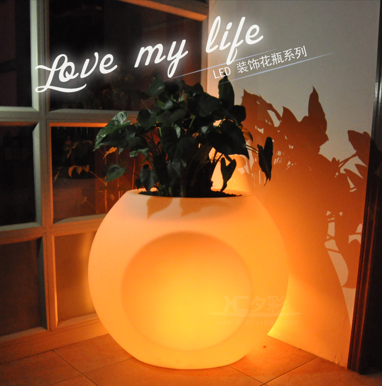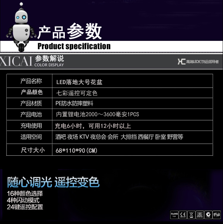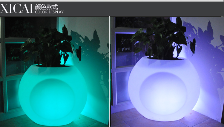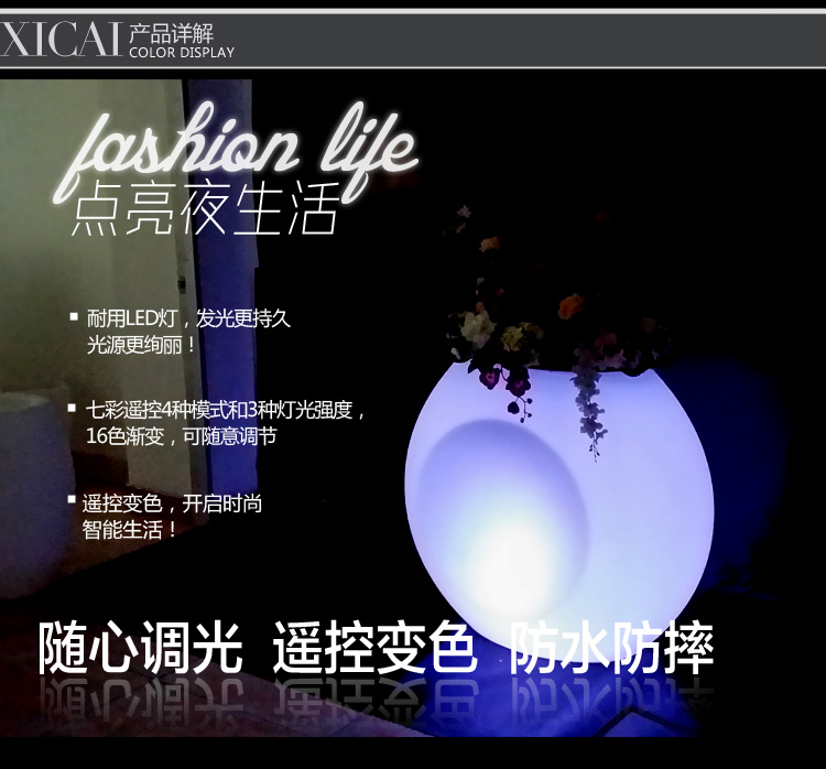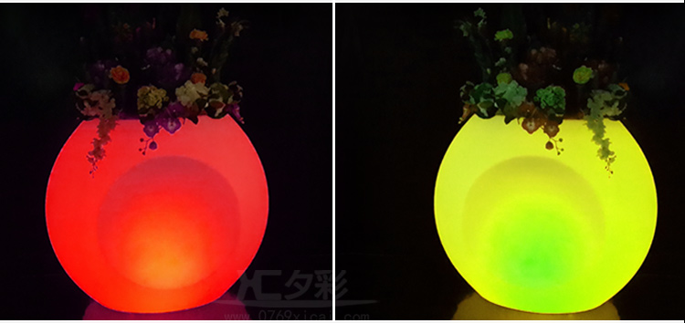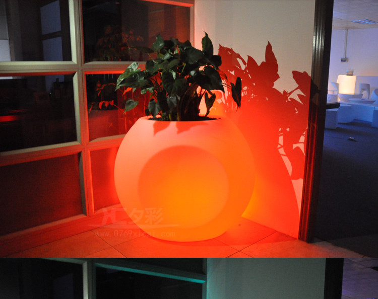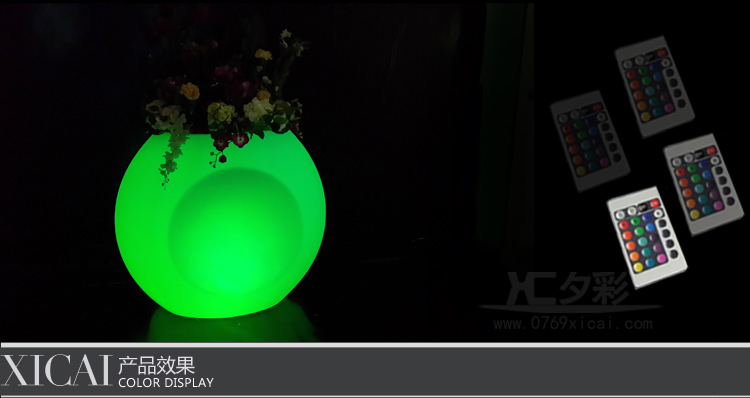 产品外壳采用PE环保材料滚塑一次成型,利用LED的色彩模式(RGB)原理,可用遥控器控制颜色慢速、快速变化,红、橙、黄、绿、青、蓝、紫、种颜色和亮度。