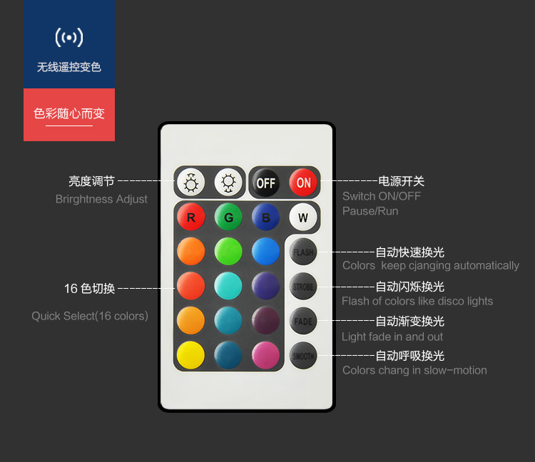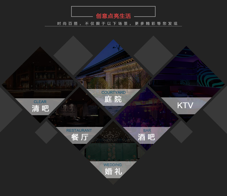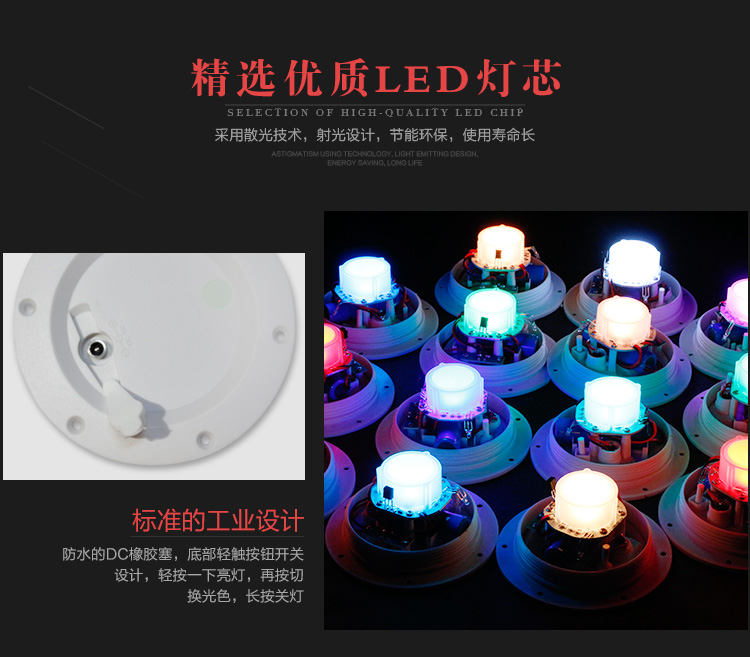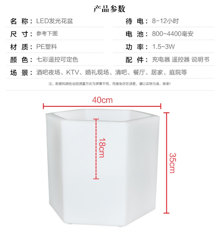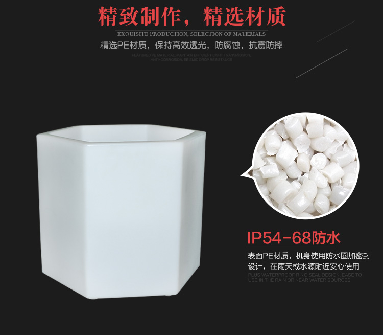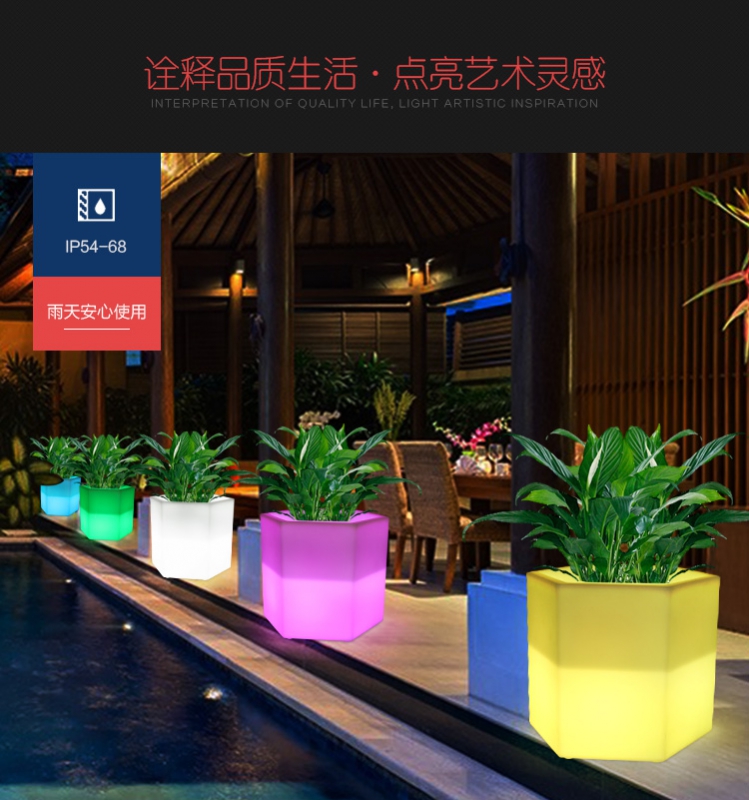 产品外壳采用PE环保材料滚塑一次成型,利用LED的色彩模式(RGB)原理,可用遥控器控制颜色慢速、快速变化,红、橙、黄、绿、青、蓝、紫、种颜色和亮度。