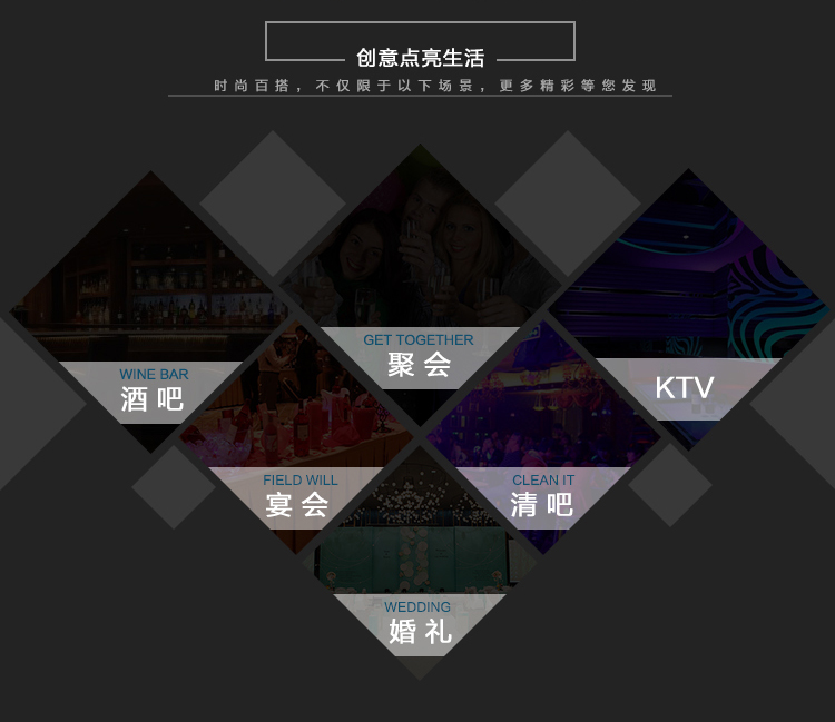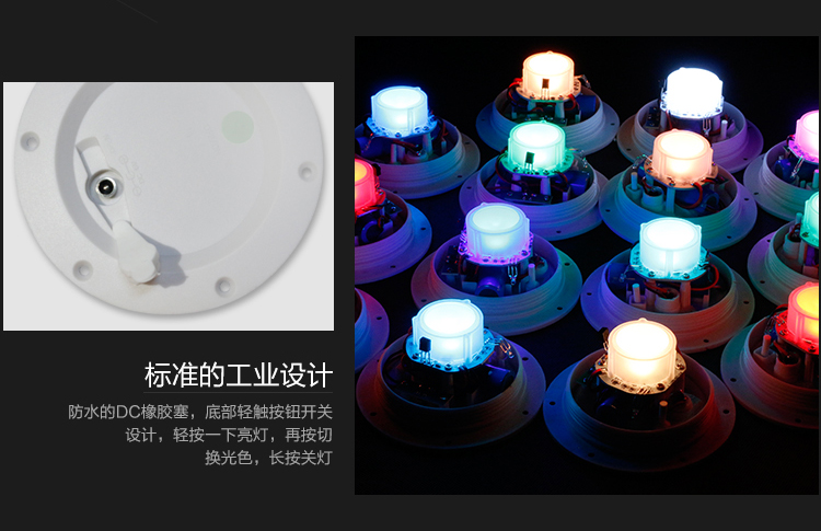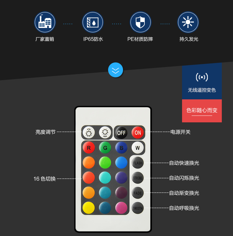 产品外壳采用PE环保材料滚塑一次成型,利用LED的色彩模式(RGB)原理,可用遥控器控制颜色慢速、快速变化,红、橙、黄、绿、青、蓝、紫、种颜色和亮度。