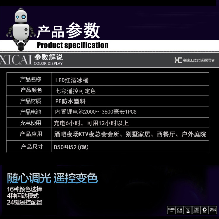 产品外壳采用PE环保材料滚塑一次成型,利用LED的色彩模式(RGB)原理,可用遥控器控制颜色慢速、快速变化,红、橙、黄、绿、青、蓝、紫、种颜色和亮度。