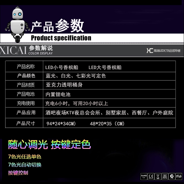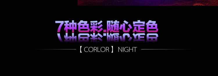 产品外壳采用PE环保材料滚塑一次成型,利用LED的色彩模式(RGB)原理,可用遥控器控制颜色慢速、快速变化,红、橙、黄、绿、青、蓝、紫、种颜色和亮度。