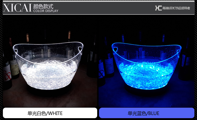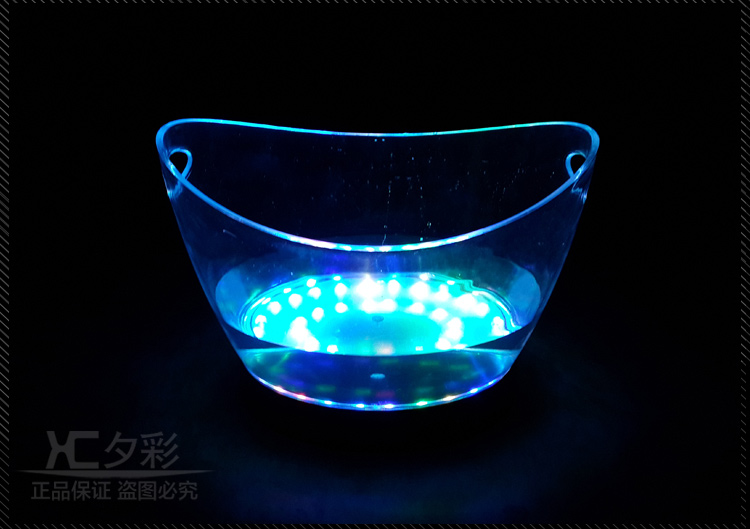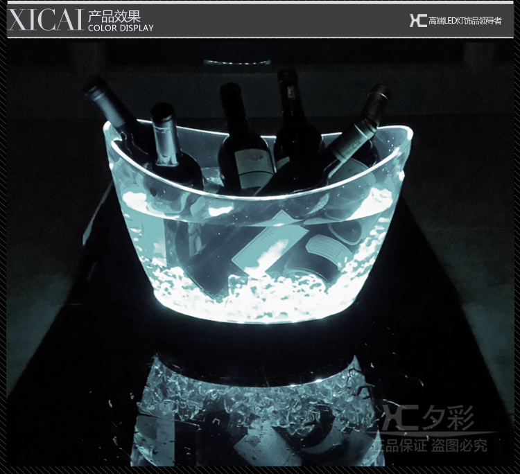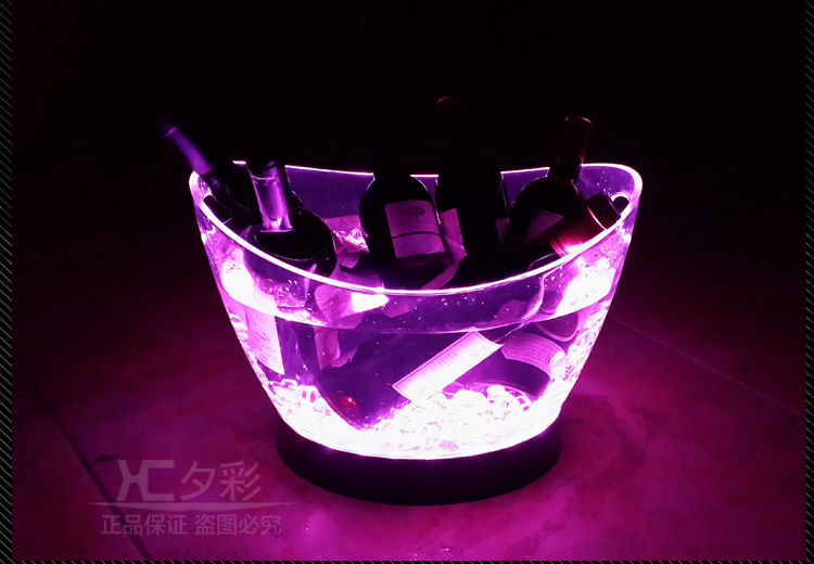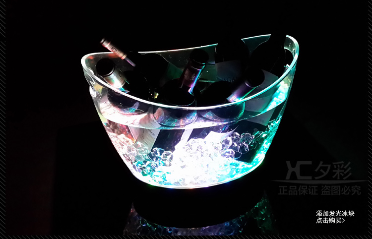可充电发光冰桶,灯体采用优质透明塑料,全新订制锂聚合物电芯,品质优良!光效华丽,防摔耐用,适合红酒、香槟、啤酒、饮料使用,是高档会所、豪华酒吧、KTV夜场、包厢,打造氛围,提高销售业绩不二之选!