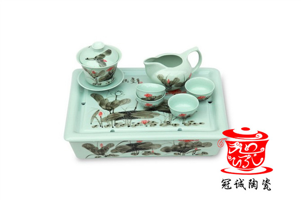【冠诚陶瓷】手绘茶具11寸荷花方形茶船