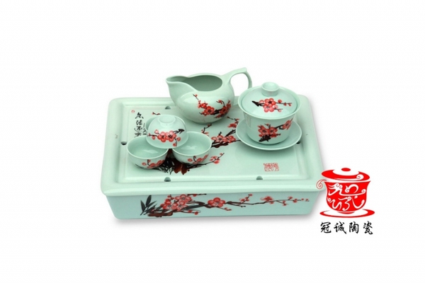 【冠诚陶瓷】手绘茶具11寸红梅方形茶船