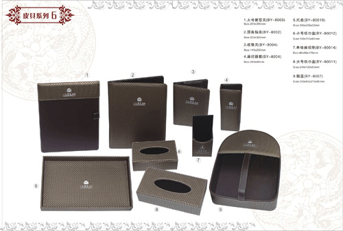 销售热线:020-86250551 手机:13727000964 13922279163 QQ:920851114 酒店皮具客房用品类:酒店用品,客房皮制品、杯垫、指示牌、垃圾桶、纸巾盒、纸巾筒、写字板、遥控器套、遥控器座等 。酒店皮具大堂用品类:酒店皮夹,酒水夹,收银夹,皮制大班台垫,皮质冰桶