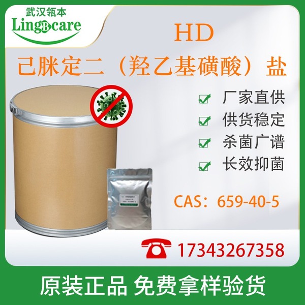 己脒定二(羟乙基磺酸)盐是一种水溶性的具有广谱抗菌和杀菌性能的阳离子性物质,它对各种革兰氏阳性菌及阴性菌以及各种霉菌和酵母菌都有很高的的杀菌和抑菌性能,而且非常温和。HD在化妆品和其他行业具有非常重要且广泛的应用。