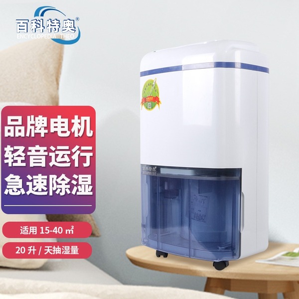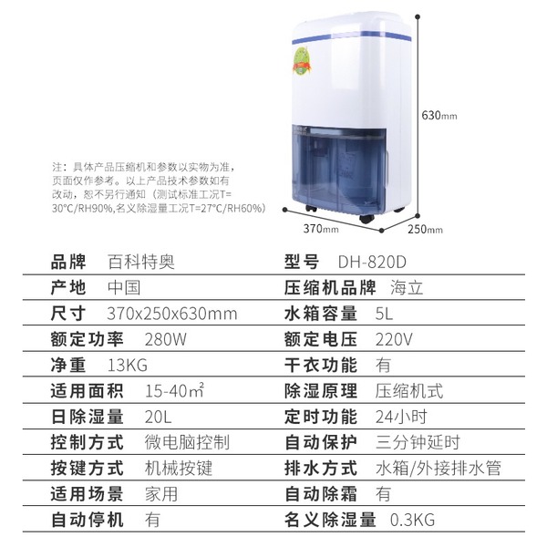 百科特奥20升除湿机DH-820D除湿机除湿原理:本产品属冷冻式除湿机,整机有压缩机、热交换器、风扇、机壳及控制器组成,其工作原理是:由风扇将潮湿空气抽入机内,经过制冷系统(压缩机,蒸发器,冷凝器)相互作用下凝结成霜,系统自动升温化霜成水流入盛水箱,产生出干燥空气排出,如此循环使室内湿度降低,潮湿空间逐步达到干爽的效果。