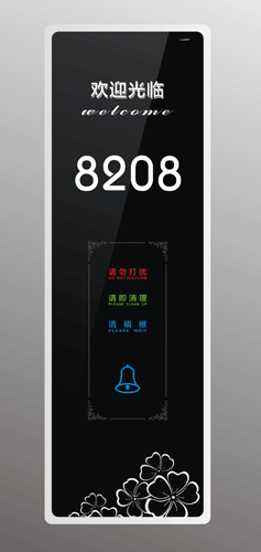 2.客人按下房间内的“请立即清理”开关,触摸屏的“请立即清理”图案背光被点亮,门外的显示器提示房号需要清理
