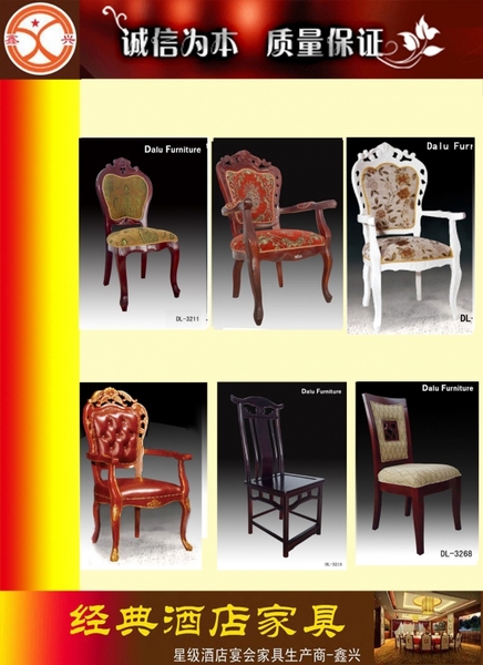 产品主要有会议椅、会议桌、宴会桌(铝椅、钢椅)宴会桌、中餐桌、实木餐桌餐椅(椿木、桦木、橡木)电动餐桌、玻璃转盘、折叠餐桌、长条桌、火锅桌、西餐桌椅、宝宝椅、吧椅、快餐椅、家具桌椅配件、舞池板、舞台运输车、椅子运输车、椅套和配套的一系列台布、席布••••••等;品丰富、规格齐全、款式新颖、经久耐用、为诸多星级酒店、度假村、企业集团、贵宾酒楼、商务公寓、提供星级、个性化服务。专业木质及金属酒店餐桌餐椅、电动餐桌系列生产——山东临朐鑫兴家具