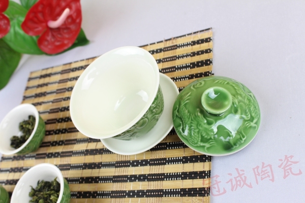 【冠诚陶瓷】茶具青龙浮雕盖碗
